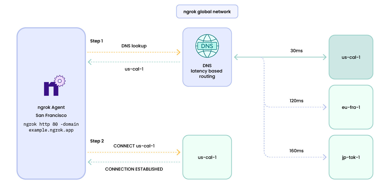 In addition to increasing performance, ngrok’s GSLB also improves resilience. As mentioned before, ngrok has dozens of PoPs deployed around the globe, which ensures that in the case of any network interruption, ngrok will route user traffic to the next-closest reachable alternative. All this geo-aware rerouting happens without your intervention, ensuring maximum availability for your applications with none of the complex networking tasks.