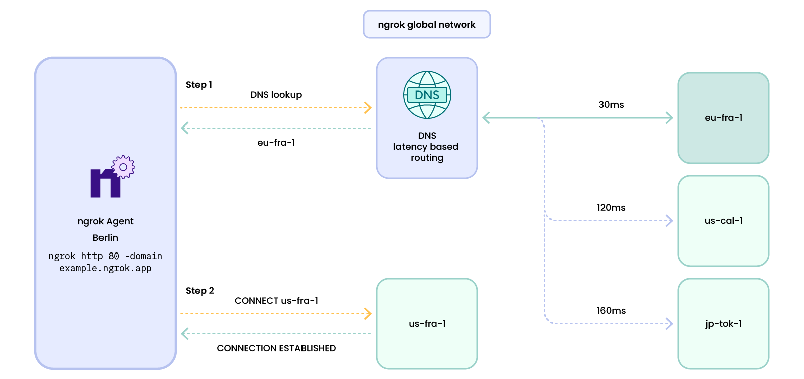 In the graphic below, the API consumer is located in Berlin, so ngrok would route traffic first to its Europe-based PoP eu-fra-1