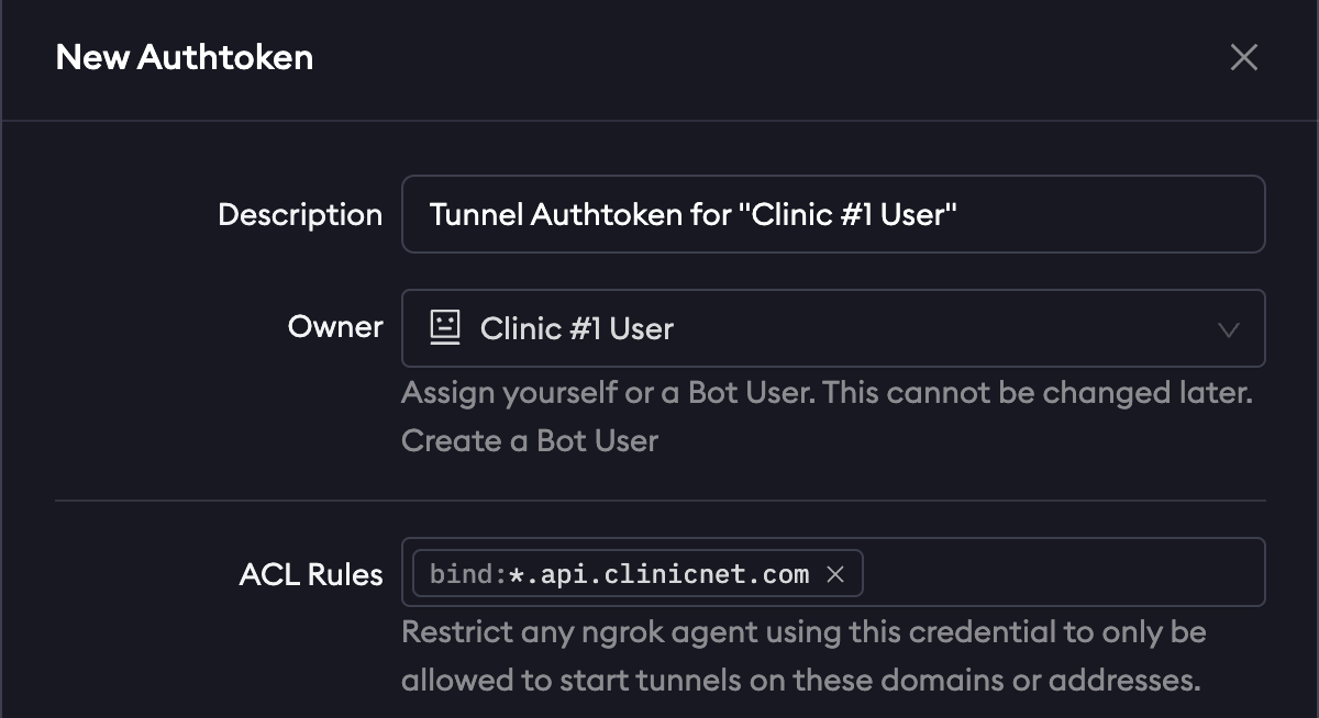 Navigate to the ngrok dashboard under *Authtokens` and create an authtoken for that bot user and assign it an ACL Binding, so that it can only create endpoints bound to the reserved wildcard domain for that clinic’s rest api.