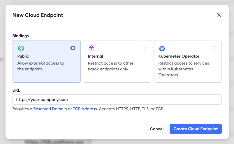 You specify a subdomain, like your-company, and attach that to one of the available root domains—e.g. ngrok.app