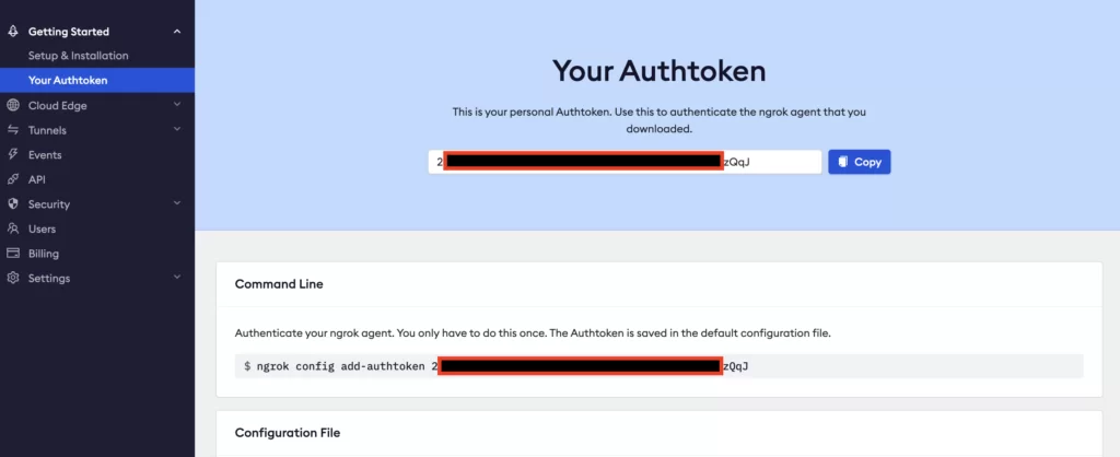 Now connect the ngrok agent running on your local machine to your ngrok account. Copy the code in the “Command Line” box on the Your Authtoken page, paste it into your command line, and press enter.