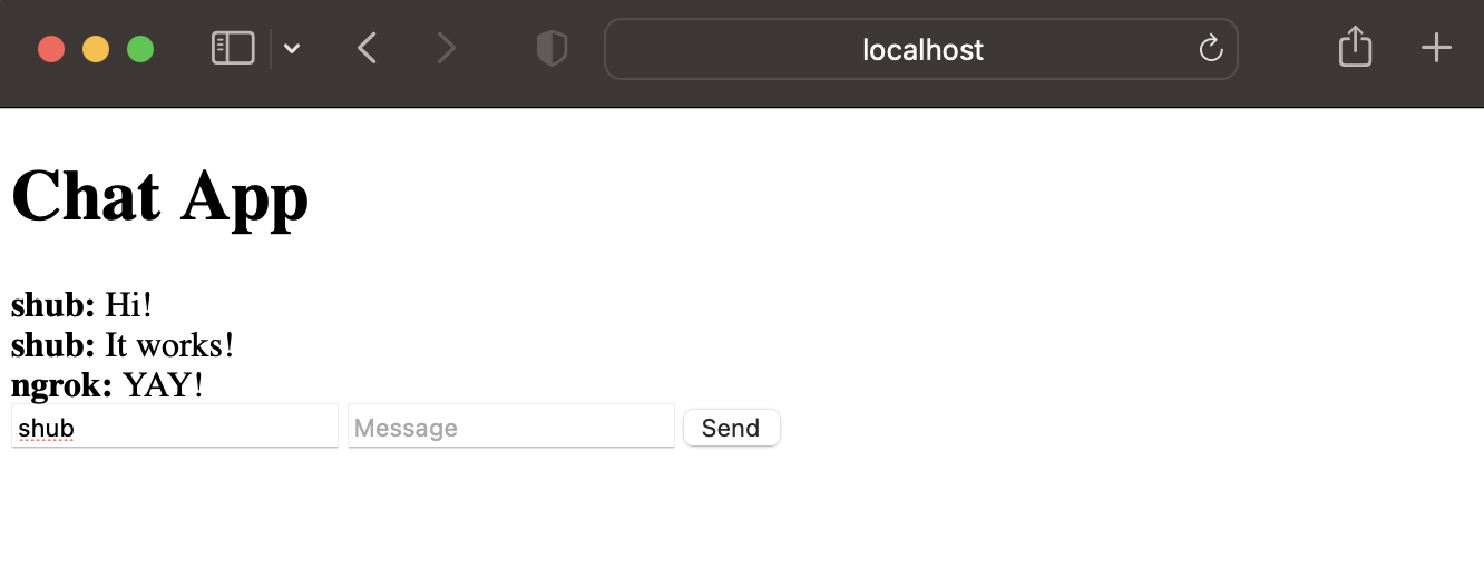 Congratulations! We now have the chat app running on our local machine that we can access by going to http://localhost:8080 on any browser and test by typing in a message and clicking “send”. However, keep in mind that this app isn’t on the internet yet, so only we can interact with it on the machine we are using. If we send the localhost link to one of our friends or try to access it from a phone, we won’t be able to see the chat app since it’s still on localhost.
