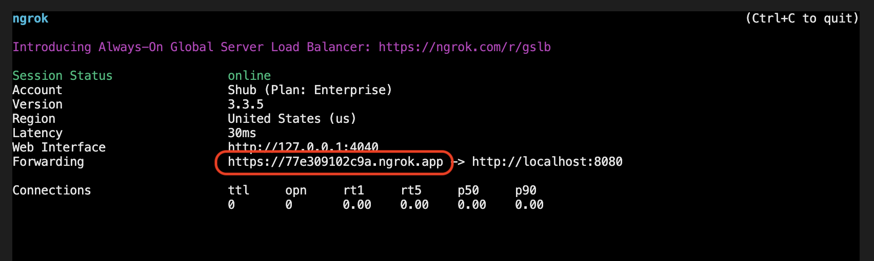 The highlighted URL is where your app lives online. This URL is randomly generated by ngrok, so yours will be different than the one you see here. You can also use a static domain, or a custom domain you already own, but that’s outside the scope of this post.