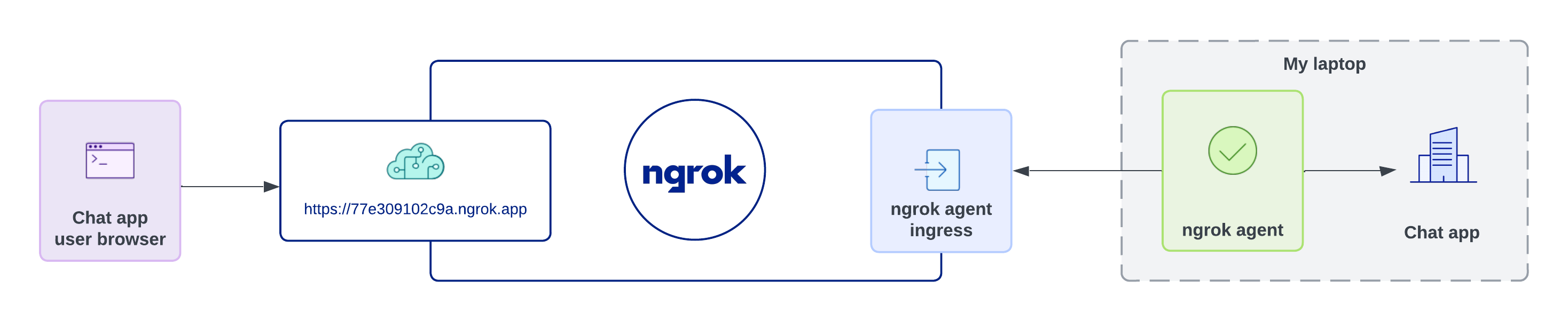 When the chat app user connects to the generated URL, ngrok will automatically proxy the request through the agent tunnel to the chat app on my laptop, and the response will be proxied back through the ngrok platform to the user’s browser. The final architecture will look like this: