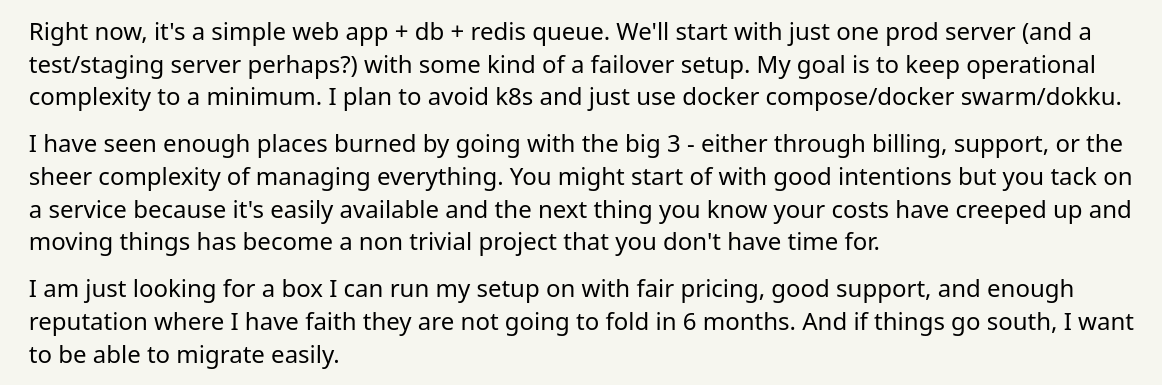 Some folks will always advocate for hyperscalers, which offer products for every possible infrastructure you could want to deploy or feature you tell yourself is on the critical path—albeit with extra complexity and cost. A handful will laugh at the idea your company needs anything more sophisticated than the cheapest VPS you can find and a few Docker containers.