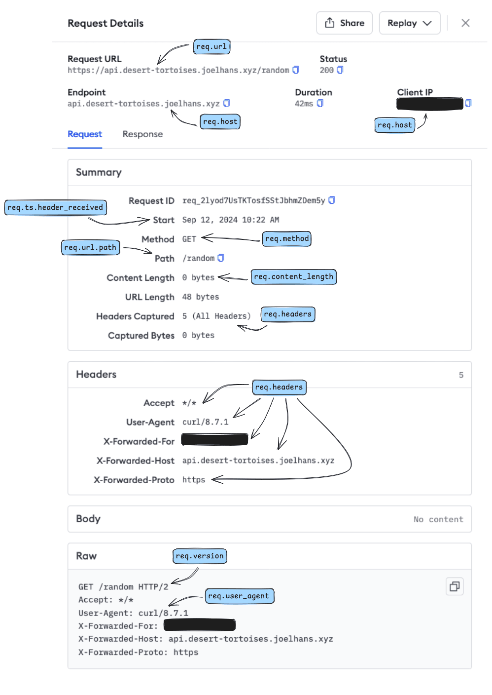 If you can’t intuit exactly which request variables would be useful for you right away, let’s visualize request variables another way. When a request reaches your ngrok endpoint, even for the most basic of “tortoise facts” APIs, it contains far more than a target URL and client IP address—and ngrok even adds more context along the way. Your Traffic Inspector dashboard puts all this data into a nicely designed and human-readable format.