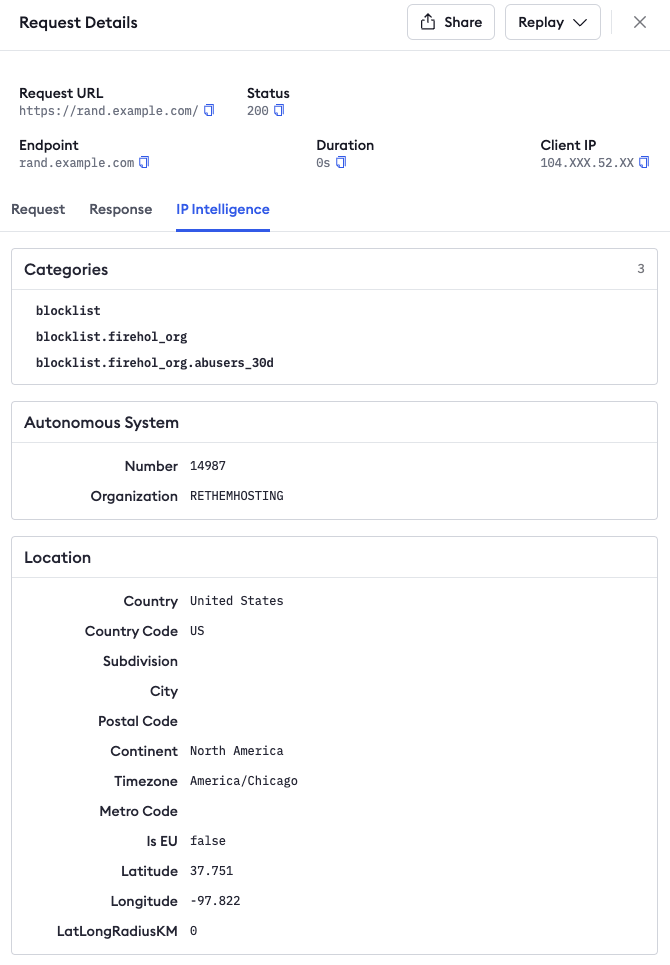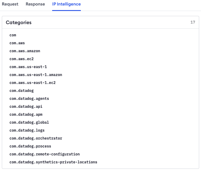 Behind the scenes, we’ve built a system that fetches a large number of public datasets and aggregates them into a data store that can be dynamically injected into each request. This data comes from lists aggregated from the cybersecurity community, as well as lists published by organizations so that their users can leverage that information when building out integrations with their systems. The full list of sources is available in our IP Categories documentation.
