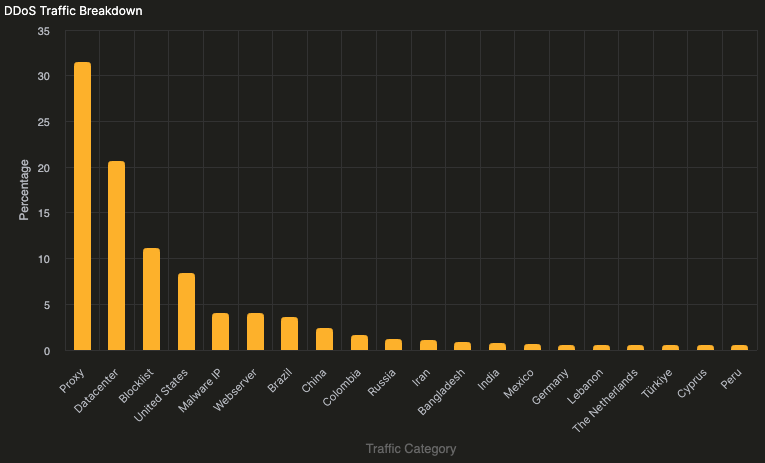 Looking at the traffic hitting our site, we were easily able to get a breakdown of the traffic categories and realized the bulk of traffic was coming from IPs that are known proxies and datacenters.