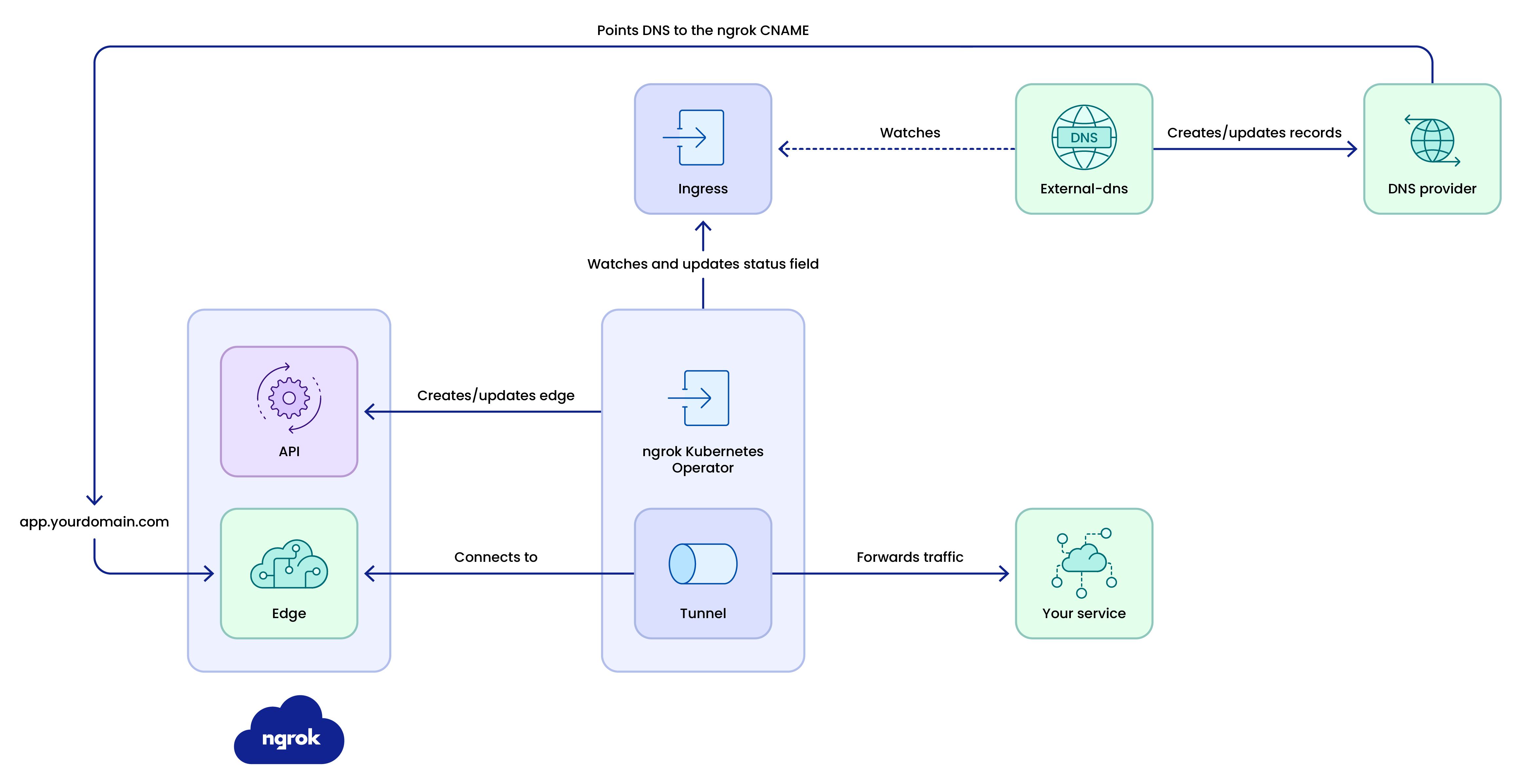 .The ngrok Kubernetes Operator collapses these steps into a simpler ingress configuration. You don’t need to install and manage cert-manager, as certificates are automatically provisioned and managed by ngrok. If you only use ngrok subdomains or manage DNS manually, you don’t need to install and configure ExternalDNS. If you are using your own subdomain with ngrok (app.yourdomain.com, for example), you can continue to use ExternalDNS to automatically create CNAME records pointing to ngrok for ingresses created by the ngrok Kubernetes Operator. This diagram below shows how the operator automates edge provisioning in the ngrok API and forwards traffic from ngrok’s edge network to your service in Kubernetes.