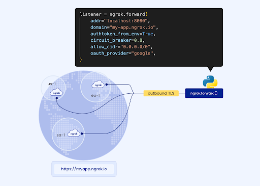 ngrok-python creates a secure and persistent outbound TLS connection to ngrok’s ingress-as-a-service platform.