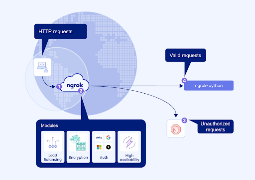 After a connection has been established, ngrok transmits that configuration information through the nearest Point of Presence (POP) and applies the modules defined by your application. Any unauthorized requests are blocked at the edge, ensuring only authorized requests reach your application.