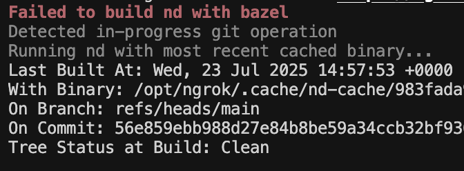 When nd fails to build, we can either automatically run the last known good build, or suggest the developer re-run the command and helpfully print the exact invocation of nd they need to run the same command using this cached build.