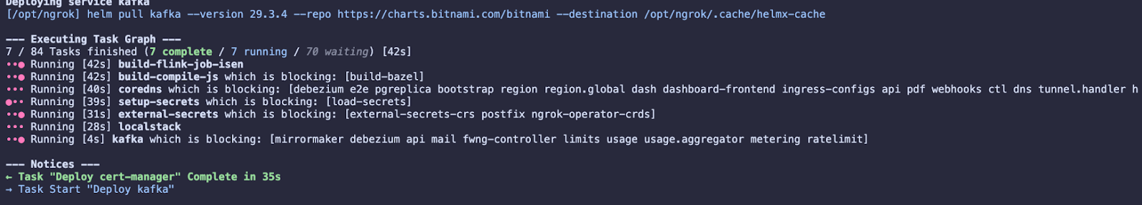 Other developers can view the progress of a rollout, developers are notified of the rollout progress via Slack, and the pipeline avoids issues we’ve had in the past like interrupted sessions from a developer losing internet access mid-deploy.