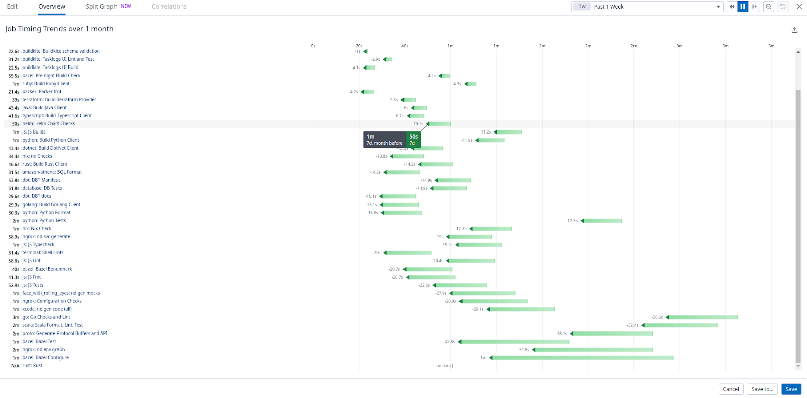 Bazel also enabled us to build faster. While repeated builds of the same software are generally fast on any given developer’s machine, new builds were often quite slow because we always had to build from scratch. Bazel gave us incremental, remote caching, which enables us to share the results of build work between CI and developers, reduce the work any given build had to do, and ultimately make all builds faster.