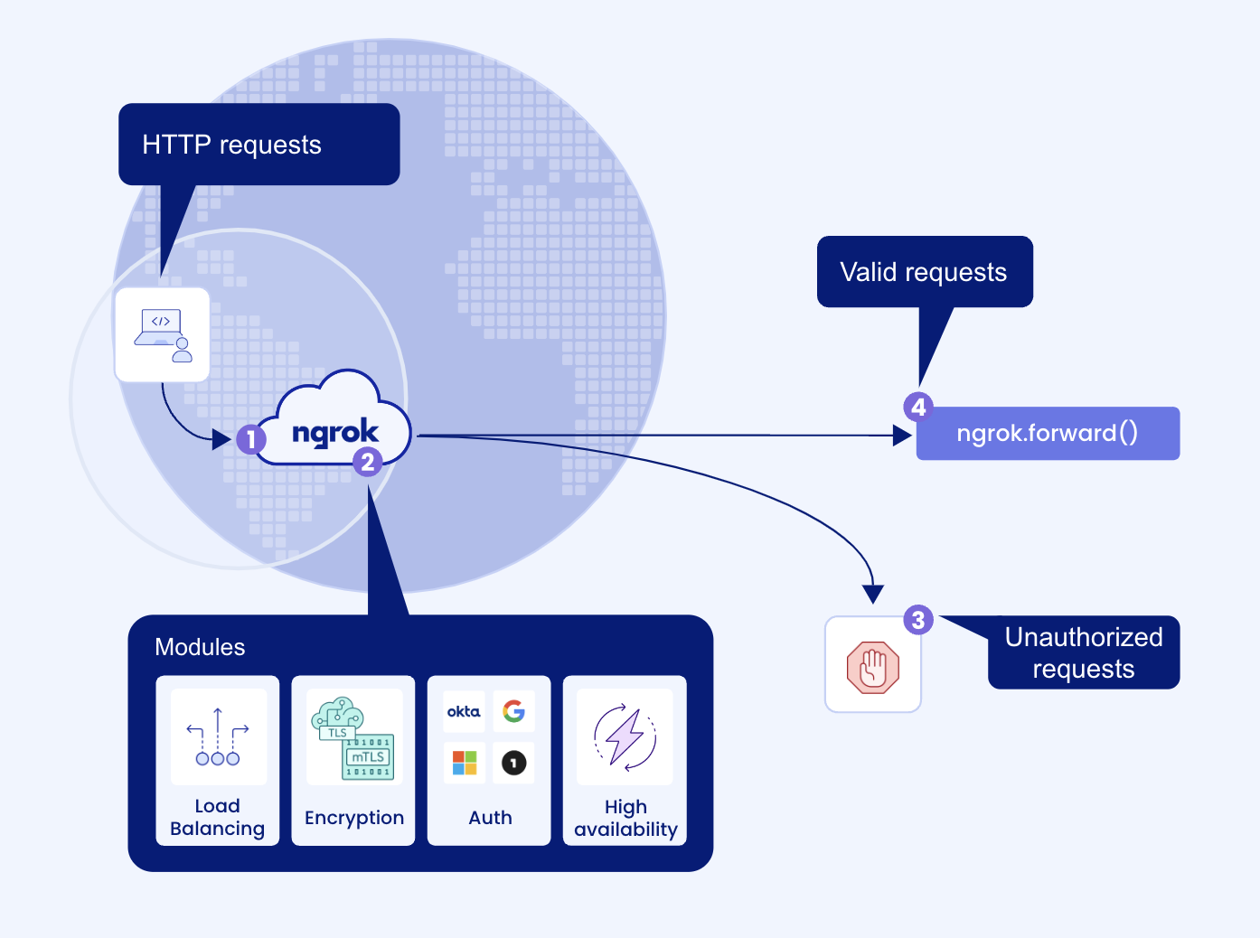 Once a connection has been established, ngrok transmits the configuration information through the nearest Point of Presence (PoP) and applies the modules defined by your application. Any unauthorized requests are blocked at the ngrok edge to ensure that only authorized requests reach your application.