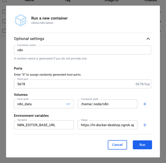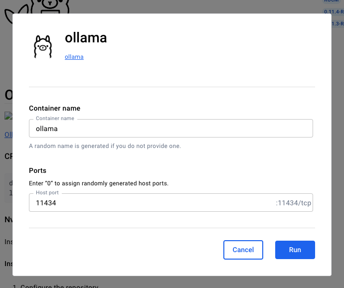 Click on Docker Hub, search for Ollama, click Run. Give it a name like ollama (wild, I know) and the default host port of 11434.