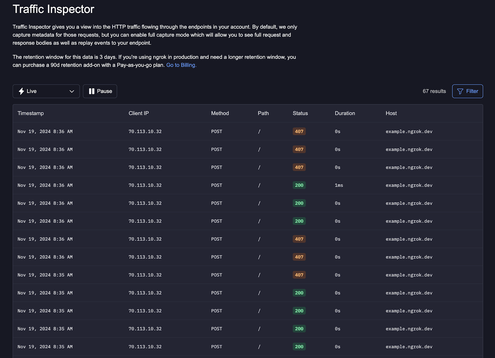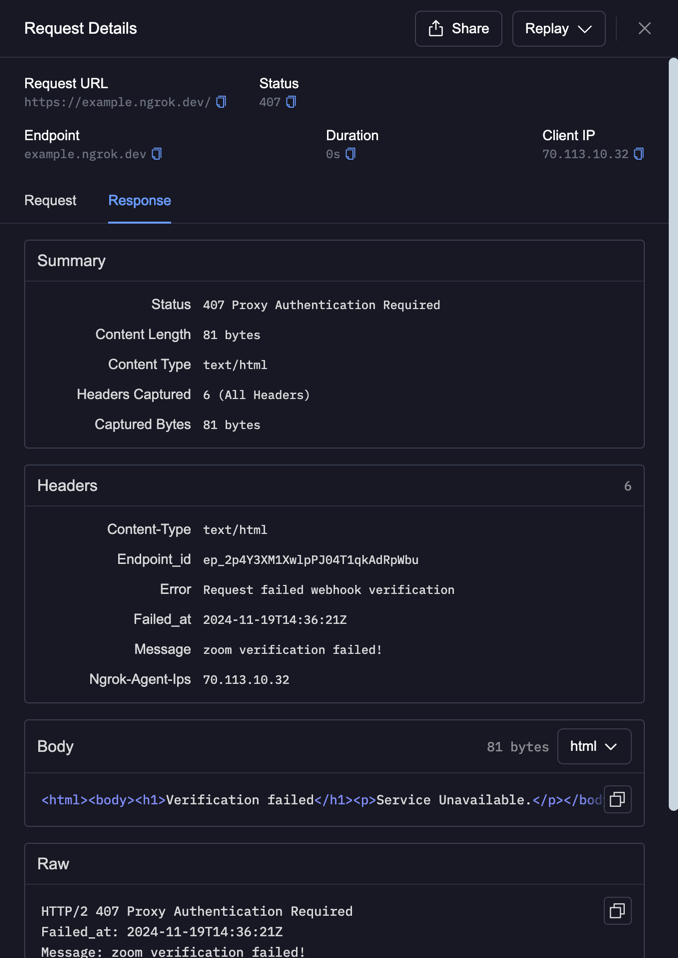 If the webhook validation fails, ngrok immediately rejects the request in our global network.