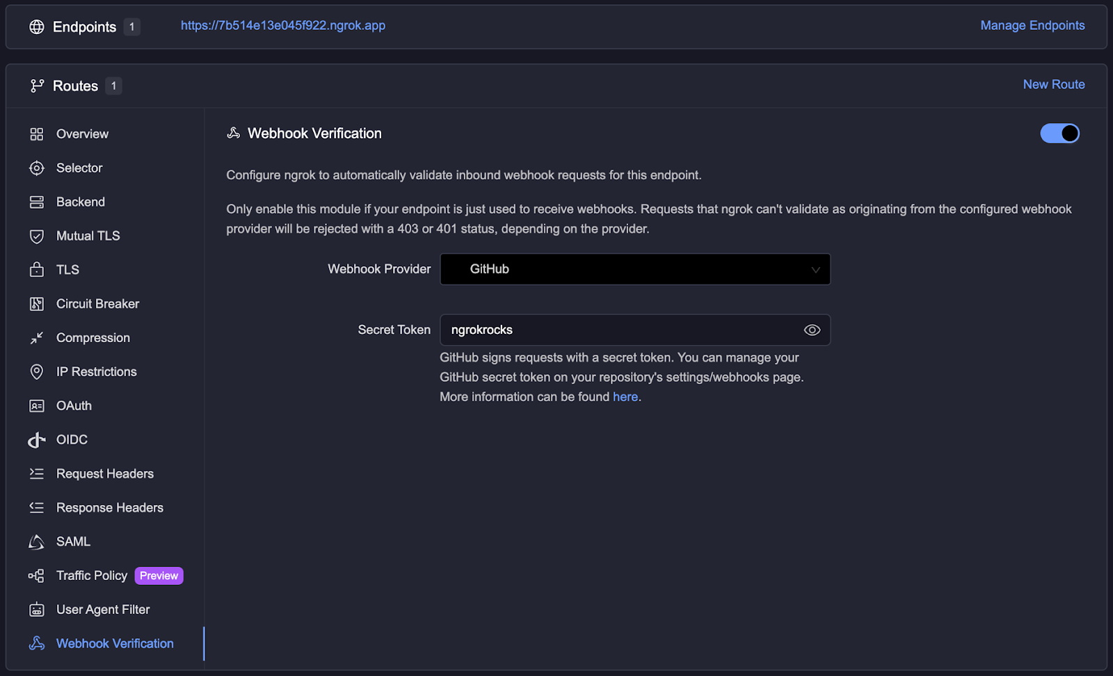 This traffic policy action equips you to safely integrate webhooks into your applications without writing any verification code. It also allows you to develop and test webhooks without deploying applications to a public environment or configuring HTTP.
